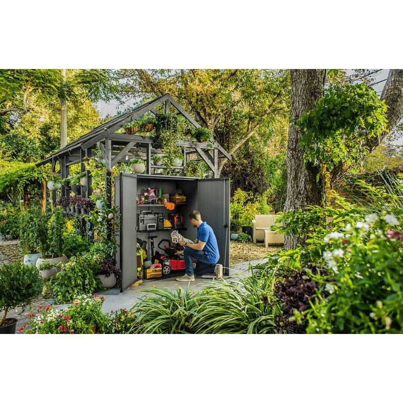 Enjoy a durable and versatile storage solution for your garden equipment with the Keter 4’x2′ Cortina Alto Heavy Duty Vertical Plastic Garden Shed with Shelves.