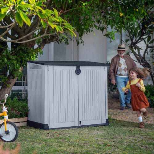 If you’re looking for storage that’s built with features that make your life easier, the Keter Store It Out Midi is the answer. Durable and weather resistant for many years of maintenance-free use, it also comes with a special bin-opening kit that lets you open your trash bins just by lifting the lid of the unit – perfect when you only have one free hand. With a full 880 L/31 cu. ft. of space, its ventilation panels promote airflow. The unit can be locked to keep your things safe, and a built-in floor panel keeps them clean and dry. It even has a built-in support for a shelf (shelf not included) to make the most of your space. It’s easy to take home and assemble, too. Because easy is what the Keter Store It Out Midi is all about.